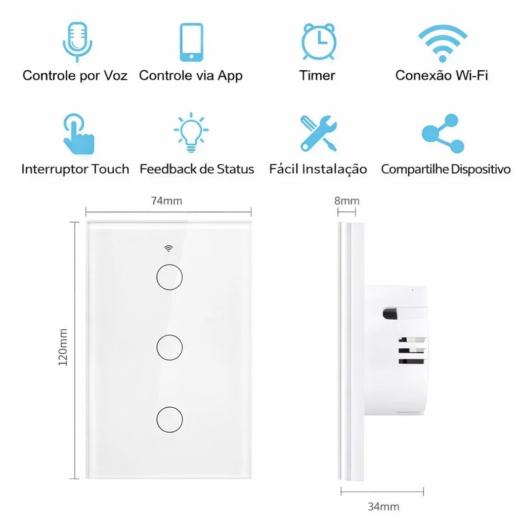 Trata-se de um interruptor touch, com frente em vidro, compatível com o ecossistema Tuya / Smart Life, disponível em versões de uma até quatro teclas. Ele se conecta diretamente ao Wi-Fi (2.4 GHz), não exige hub e pode operar com ou sem fio neutro, algo que muda completamente o jogo para casas antigas.